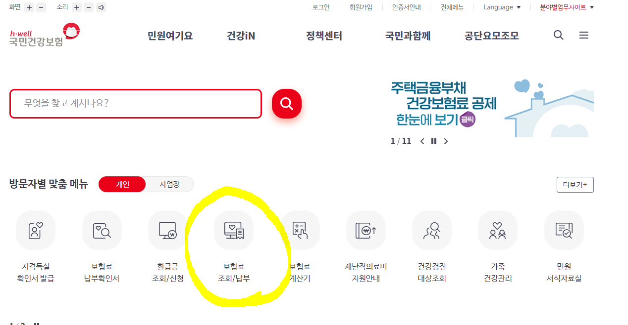 하단의 화면과 같은 사이트가 바로 건강보험료를 납부할 수 있는 사이트입니다.