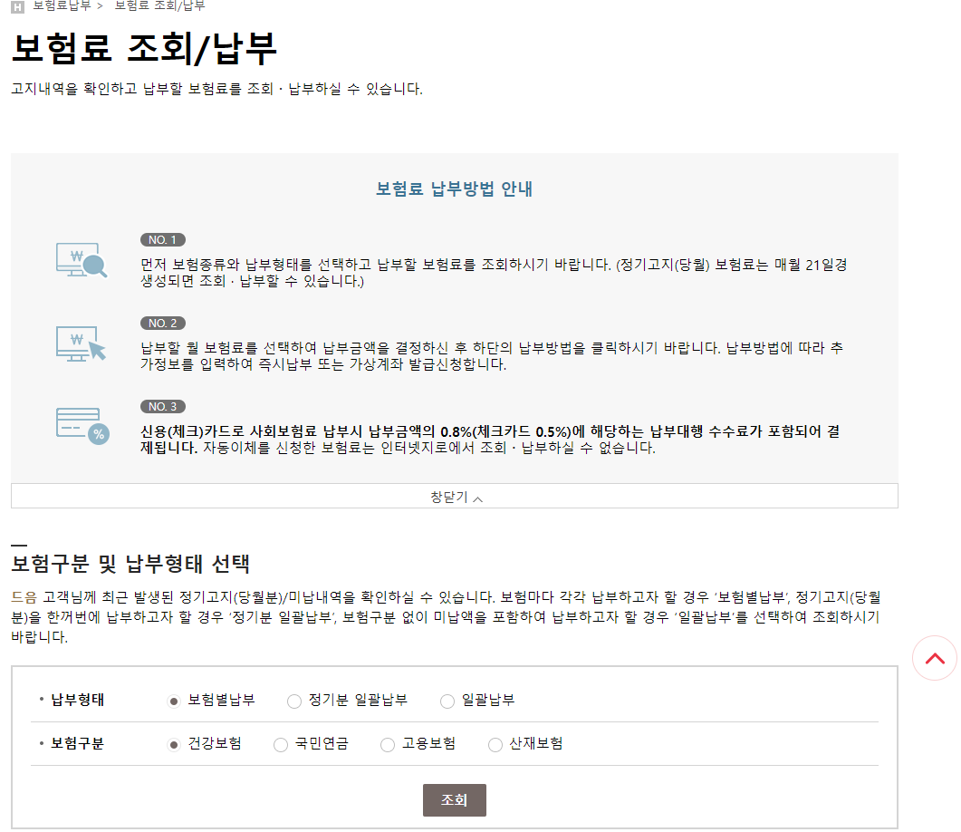 바로 기간을 조회하신 후 보험료 납부 바로가기를 클릭하시면 미납금액을 납부하실 수 있습니다.
