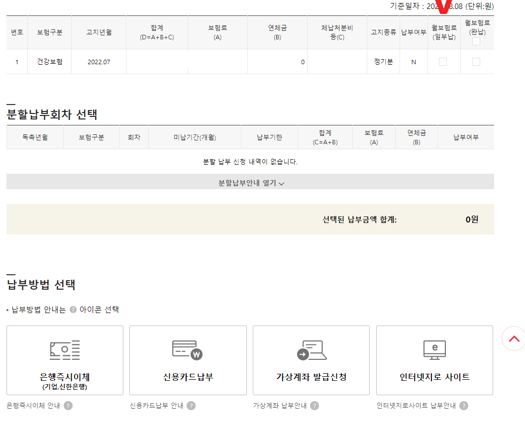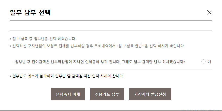 월보험료(일부납)을 클릭하시면 팝업창이 뜹니다. 이중 납부방법중 원하시는 방법을 선택하실 수 있습니다.