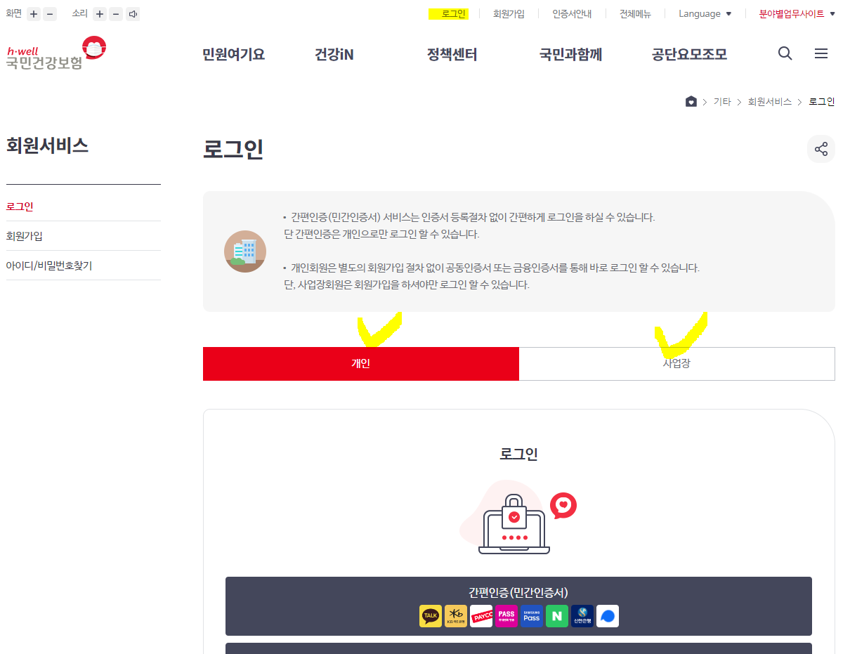 로그인은 개인이나 사업장을 선택하셔서 인증서 혹은 간편인증으로 로그인 하실 수 있습니다.
