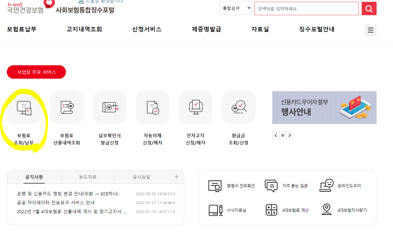 메인의 보험료 조회 납부 버튼을 클릭하신뒤