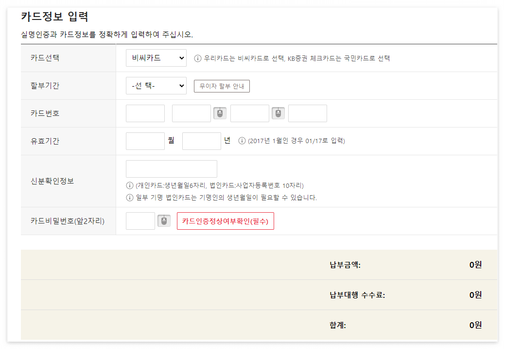 카드 인증정상여부확인까지 누르시면 수수료를 포함한 금액을 조회하실 수 있습니다.