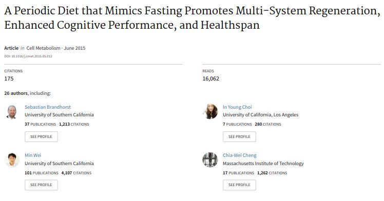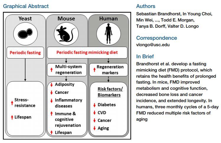 낮은 수준의 포도당과 IGF-1, 높은 수준의 케톤체 및 IGFBP-1(Longo and Mattson, 2014)을 포함하여 PF에 의한 스트레스 저항과 관련된 표지에 대한 (다이어트 모방, FMD) 표준 지방 섭취에 이어 4일간 지속되는 FMD 주기가 생쥐의 건강 범위를 촉진할 수 있다는 가설을 테스트했다. 또한 38명의 피험자를 대상으로 한 파일럿 무작위 임상 연구에서 유사한 FMD의 3주기 효과를 테스트했으며, 그 중 19명이 FMD 그룹에 배정되었다.