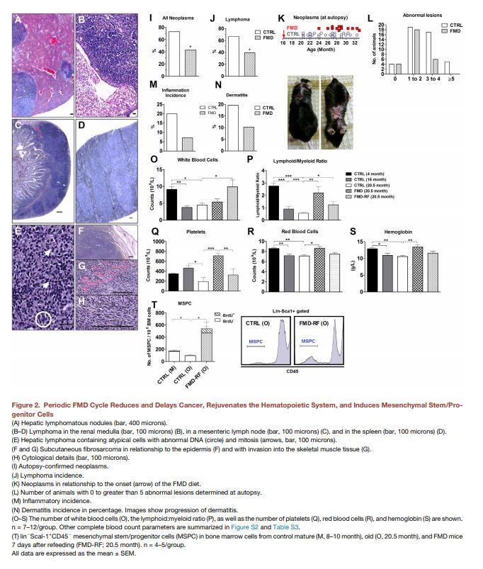 조혈의 연령 관련 감소는 림프액 대 골수체의 비율의 변화 및 빈혈과 골수성 악성종양의 증가로 나타나는 적응성 면역세포의 감소 또는 변형을 야기한다(그림 2O–2S). 전체 혈액 수는 FMD가 혈액 프로파일의 회춘을 유발한다는 것을 나타낸다(그림 2O–2S, 그림 S2E–S2R, 표 S3).