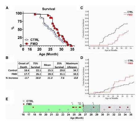 우리는 단식으로 인한 것과 유사한 스트레스 저항성 또는 수명(IGF-1, IGFBP-1, 케톤체, 포도당)과 관련된 표지의 변화를 일으키는 매우 낮은 칼로리/저단백 단식 모방 다이어트(FMD)를 개발했다(표 S1). 생쥐에게 생후 16개월부터 월 2회씩 먹이고 FMD 주기 간에는 지방질 식단을 먹였다. 대조군 식단을 먹은 생쥐는 생후 21.5개월에 최대 체중(36.6 ± 5.2g)에 도달한 반면, FMD 집단의 생쥐는 각 FMD 주기 동안 체중이 15% 줄었지만 재급유 시 체중의 대부분을 회복했다(그림 S1A). 그러나 FMD 그룹 생쥐는 16~22개월 동안 일정한 체중을 유지한 후 점차 체중이 감소하였다(그림 1D).