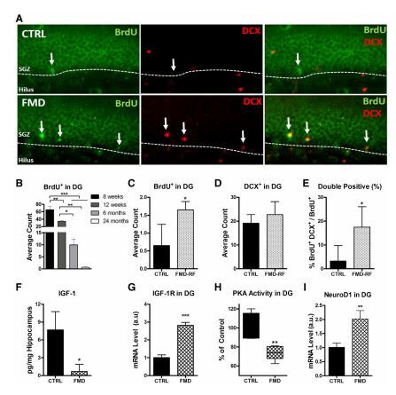 FMD 마우스에서 미세 해부된 치의회색 농축 검체는 신경방호 및 분화에 중요한 전사 인자인 NeuroD1(그림 4I)의 발현에서 PKA 활성(그림 4H)이 크게 감소하고 2배 유도가 나타났다(Gao 등, 2009). 마찬가지로, FMD의 단일 주기는 방사형 글리아 유사 세포(타입 I)와 비방사형 전구(타입 II) 신경줄기세포(그림 S4B, S4C, S4F, S4G), 미성숙 뉴런(그림 S4D 및 S4I–S4Q), 덴드라이트(end-covered)를 증가시켰다.