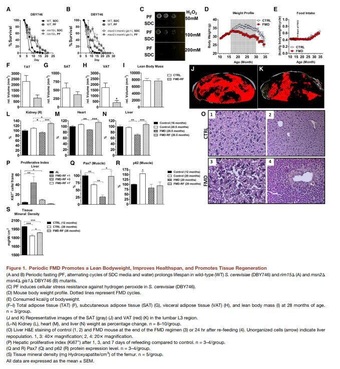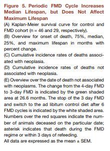 중년에 시작된 격월성 FMD 주기는 장수를 연장하고, 내장 지방을 낮추며, 암 발생률과 피부 병변을 감소시키며, 면역 체계를 회복시키며, 골밀도 저하를 지연시켰다. 늙은 생쥐의 경우, FMD 주기가 해마 신경 발생을 촉진하고 IGF-1 수치와 PKA 활성도를 낮추며 NeuroD1을 증가시키며 개선되었다.