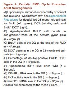이러한 두 가지 유전적 배경의 결과는 FMD이 성인 쥐의 신경생성을 촉진한다는 것을 나타낸다. 특히 FMD 기간 동안 뇌는 측정 가능한 체중 감소를 겪지 않아 섭취 후 장기 크기 증가와 별개로 재생도 일어날 수 있음을 알 수 있다. 따라서 IGF-1 수준 감소와 PKA 신호 등 순환인자 변화가 친재생성을 유도할 수 있다는 가설을 세웠다.